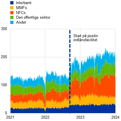 ECB hævede sine officielle renter med yderligere 200 basispoint i 2023, hvilket bragte renten på indlånsfaciliteten op på 4 %. Stramningen af pengepolitikken blev i høj grad transmitteret ud i økonomien.