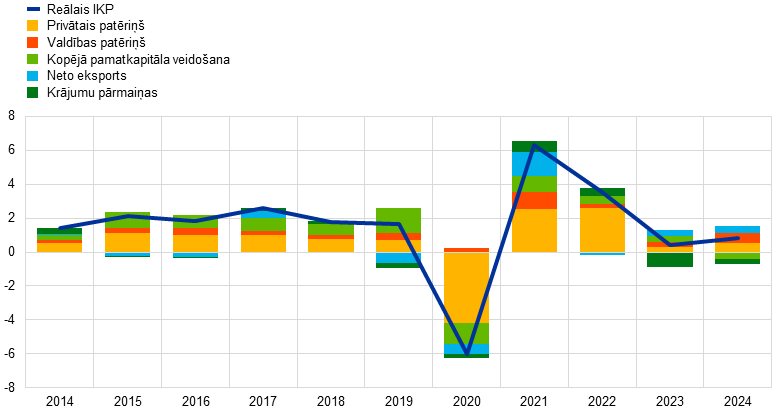 Eurozonas reālais IKP 2024. gadā palielinājās par 0.9 % (2023. gadā – par 0.4 %; 1.3. att.). Ceturkšņa pieauguma temps kļuva pozitīvs 2024. gada sākumā pēc piecus secīgus ceturkšņus ilgušas stagnācijas, bet gada beigās atkal palēninājās. Izaugsmes nostiprināšanos galvenokārt noteica pakalpojumu nozare, ko turpināja pozitīvi ietekmēt strukturālās pārmaiņas pēc pandēmijas, t. sk. straujāka pāreja uz tautsaimniecību, kas vairāk balstīta uz zināšanām, zaļā pārkārtošanās un patērētāju tēriņu paradumu maiņa. Arī reālo ienākumu atjaunošanās, globālā tirdzniecība un "Nākamās paaudzes ES" (NPES) programma veicināja tautsaimniecības izaugsmi. Vienlaikus rūpniecības nozare joprojām bija vāja gan strukturālo, gan ciklisko faktoru dēļ. Iepriekšējā monetārās politikas stingrības palielināšanas cikla joprojām ierobežojošie nosacījumi un augstās resursu izmaksas rūpniecības nozari skāra vairāk nekā pakalpojumus. Lai gan vairākums modeļu rāda, ka stingrāku nosacījumu izvirzīšanas ietekme uz ekonomisko aktivitāti augstāko punktu sasniedza 2023. gada beigās un 2024. gada sākumā, monetārās politikas stingrības mazināšanas cikls, kas sākās 2024. gada vidū, vēl nebija ietekmējis tautsaimniecību. Rūpniecības nozari ietekmēja arī eurozonas eksporta tirgus daļas zaudēšana, kā arī regulējuma problēmas un paaugstināta nenoteiktība gan saistībā ar politiskiem, gan ģeopolitiskiem notikumiem. Kopumā izaugsme 2024. gadā atspoguļoja privātā un sabiedriskā patēriņa, kā arī neto tirdzniecības pozitīvo devumu, savukārt ieguldījumi un krājumu pārmaiņas mazināja ekonomisko aktivitāti.
