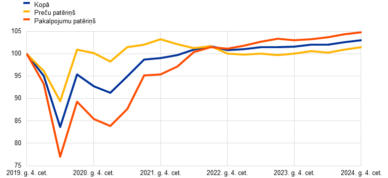 Piezīmes. Attēla a) panelī privātais patēriņš attiecas uz patēriņa nacionālo jēdzienu, un tā komponenti attiecas uz patēriņa iekšzemes jēdzienu. Jaunākie dati atbilst stāvoklim 2024. gada 4. ceturksnī.
