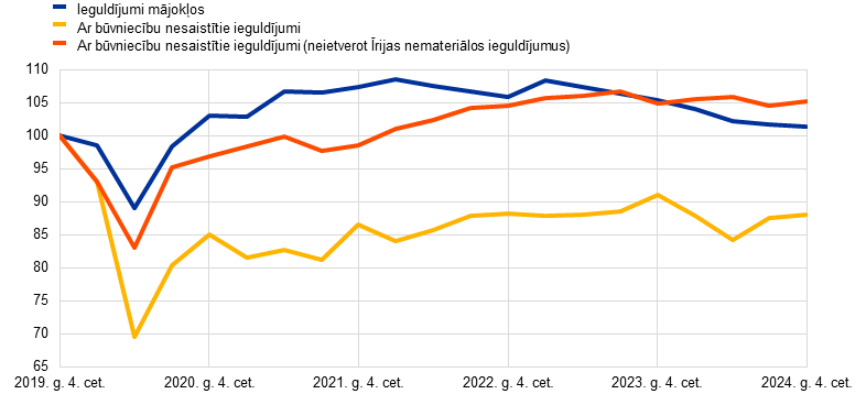 Ar būvniecību nesaistītie ieguldījumi (tuvākais nacionālo kontu rādītājs ieguldījumiem uzņēmējdarbībā) 2024. gadā atkal saruka vāja iekšzemes un ārējā pieprasījuma, stingru finansēšanas nosacījumu un lielas nenoteiktības apstākļos dažādās jomās. Kopumā ar būvniecību nesaistītie ieguldījumi salīdzinājumā ar 2023. gadu samazinājās par 2.3 %, lai gan gada laikā bija vērojams būtisks ceturkšņu svārstīgums (sk. 1.4. att.). Neietverot svārstīgos Īrijas daudznacionālos nemateriālos ieguldījumus, tie 2024. gadā saruka par 0.5 %.[1] Rezultāts atspoguļo gan mehānismos un iekārtās veikto ieguldījumu turpmāku vājumu, gan nemateriālo ieguldījumu pieauguma tempa samazināšanos pēdējos gados. Zema iekšzemes pieprasījuma un vājākas eksporta nozares apstākļos ilgāka termiņa ražošanas gaidas, kas parasti ir būtisks ieguldījumu noteicējfaktors, visu gadu joprojām bija mērenas, mazinot uzņēmumu stimulus ieguldīt. Bažas par konkurētspējas zudumu, pelnītspējas samazināšanos un lielo un plašo nenoteiktību, ko noteica ģeopolitiskās norises, arvien lielākās bailes par augošo tirdzniecības sadrumstalotību un paaugstinātā politikas nenoteiktība, arī 2024. gadā vēl negatīvāk ietekmēja ieguldījumus uzņēmējdarbībā.