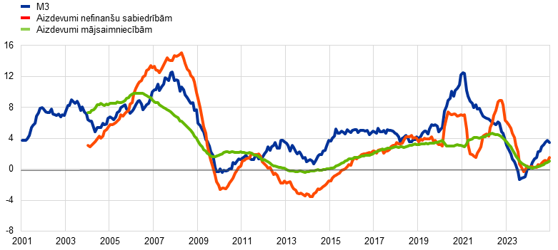 2024. gadā ECB turpināja virzīties uz priekšu monetārās politikas ciklā. Šo ciklu veidoja trīs atšķirīgi posmi. Pirmais bija stingrākas monetārās politikas posms, kas ilga no 2022. gada jūlija līdz 2023. gada septembrim, kad bija vērojams rekordaugsts procentu likmju kāpums par 450 bāzes punktiem. Otrais bija nemainīgu procentu likmju posms, kad procentu likmes saglabājās stabilas. Un trešajā posmā – procentu likmju samazināšanas posmā, kas sākās 2024. gada jūnijā, – monetārā politika pakāpeniski kļuvusi mazāk ierobežojoša.