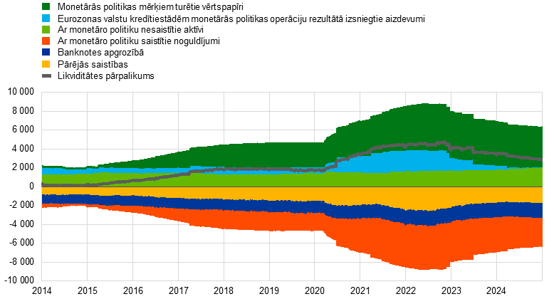 Pakāpeniskas likviditātes samazināšanās apstākļos, ko noteica bilances normalizēšanās, ECB nāca klajā ar monetārās politikas īstenošanas darbības principu pārmaiņām. Konkrētāk, ECB paziņoja, ka turpinās virzīt monetārās politikas nostāju, koriģējot noguldījumu iespējas procentu likmi, vienlaikus sašaurinot arī tās un galvenās refinansēšanas operāciju procentu likmes starpību. Turpmāk ECB nodrošinās finanšu sistēmas likviditāti, izmantojot plašu instrumentu klāstu. Un, pamatojoties uz gūto pieredzi, Padome 2026. gadā pārskatīs darbības principu galvenos parametrus.