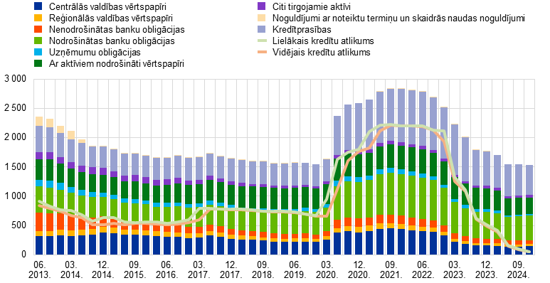 Arī mūsu bilance 2024. gadā turpināja normalizēties, sarūkot par 0.5 trilj. euro. Decembra beigās tika sasniegti divi atskaites punkti – tika veikta banku trešā ilgāka termiņa refinansēšanas mērķoperāciju kopuma ietvaros aizņemto līdzekļu pilna atmaksa un tika pārtraukta pandēmijas ārkārtas aktīvu iegādes programmas ietvaros iegādāto vērtspapīru dzēšanas termiņu sasniegušo pamatsummas maksājumu atkārtota ieguldīšana.