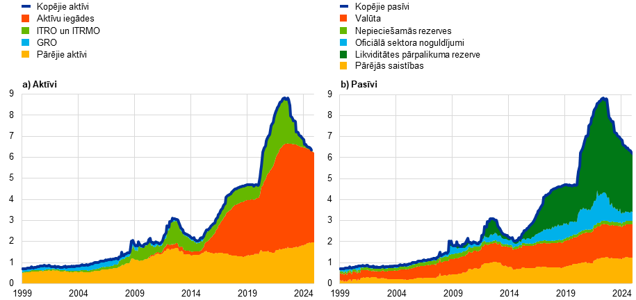 Eurosistēmas bilance samazinājās par 0.5 trilj. euro, atspoguļojot trešā ilgāka termiņa refinansēšanas mērķoperāciju kopuma (ITRMO III) pārtraukšanu, aktīvu iegādes programmas (AIP) portfeļa samazināšanos un – zināmā mērā – pāreju uz daļējiem pandēmijas ārkārtas aktīvu iegādes programmas (PĀAIP) ietvaros veiktiem atkārtotiem ieguldījumiem. Šiem pasākumiem bija būtiska nozīme zemās inflācijas periodā un pandēmijas laikā.