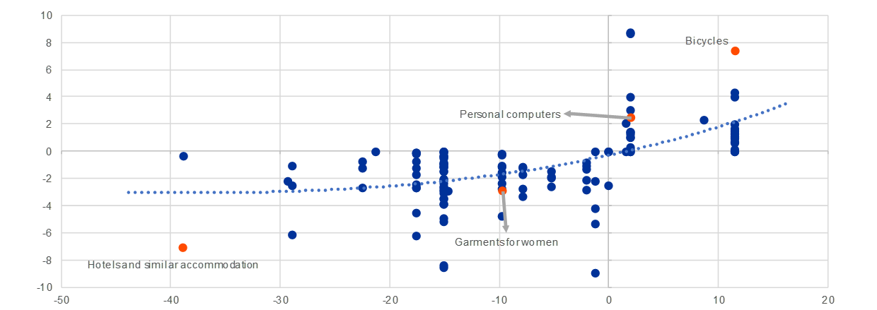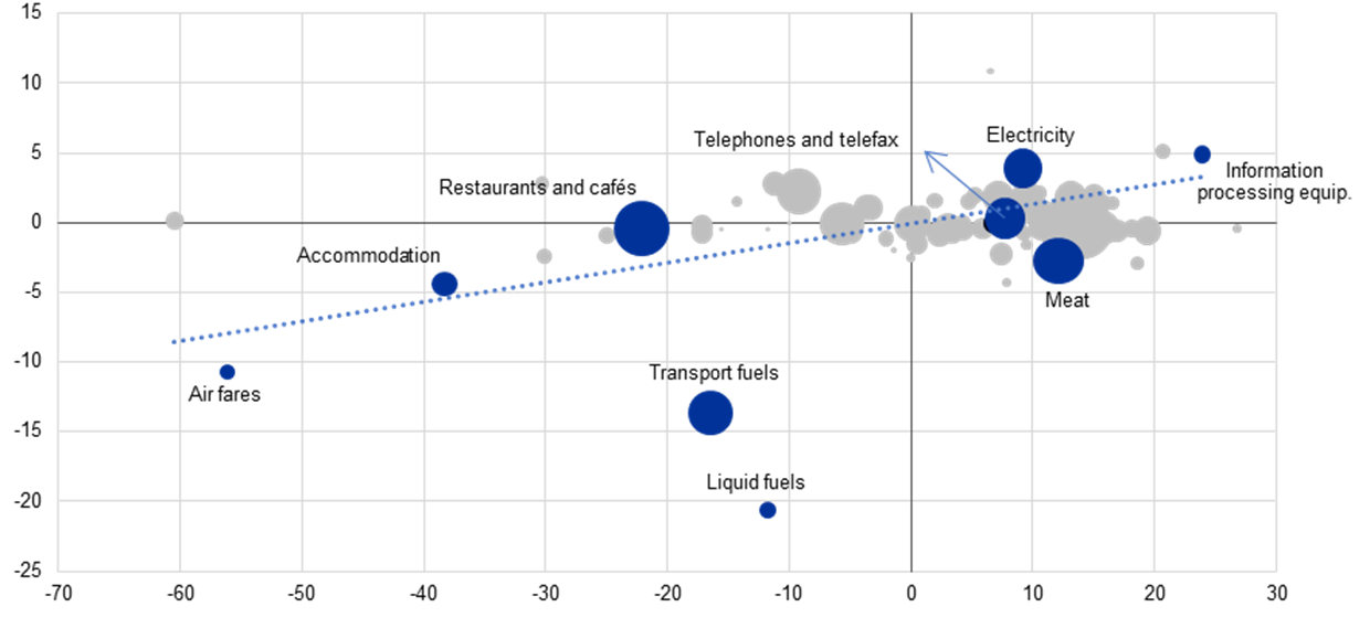 Notes: Only items for which inflation and quantities move in the same direction are shown. For the methodology on the consumption expenditure series, please see ECB (2020), “Consumption patterns and inflation measurement issues during the COVID-19 pandemic”, Economic Bulletin, Issue 7. Domestic flights and package holidays are excluded. The latest observations are for the third quarter of 2020 for consumption expenditure and for November 2020 for inflation.