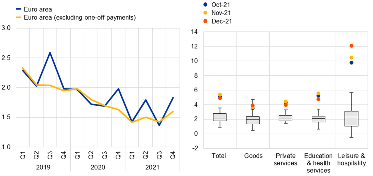 Notes: For euro area negotiated wages, the fourth quarter of 2021 is based on October and November data for the euro area. For US average hourly earnings, the grey boxes show the interquartile range, i.e. the range between the 25th and 75th percentile over the period from the first quarter of 1997 to the fourth quarter of 2019. The whiskers indicate the minimum and maximum data, excluding outliers.