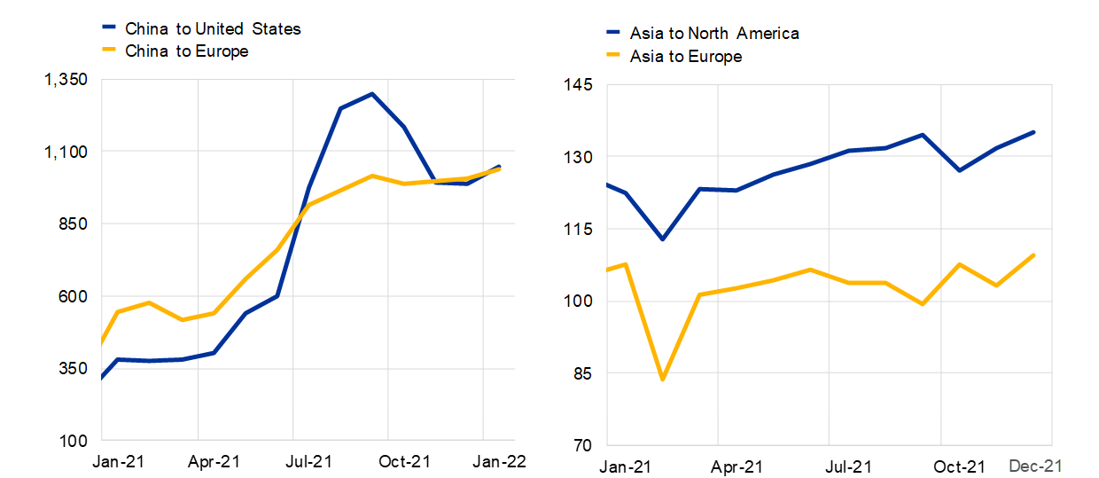 Chart 5 shows that there was a sizeable increase in shipping prices in the first half of 2021, which was particularly sharp for shipping from China to the United States. Shipping prices from China to Europe stabilised in the second half of 2021, but have not declined, whereas shipping prices from China to the United States have fallen back to a level that is now similar to the China-Europe route. The right panel of Chart 5 shows that shipping volumes increased significantly during 2021, despite serious interruptions to supply capacity due to the Suez Canal incident and geographical mismatches in container availability: the bottleneck phenomenon in relation to shipping was exacerbated by the rapid increase in demand for manufactured goods and commodities, especially from the United States.