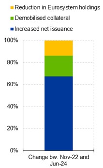 Notes: The purple line in the LHS chart reports the ratio of released collateral to total credit repaid. The RHS chart displays the share of factors contributing to the reduction of the Eurosystem’s footprint in euro area government bond markets. It considers the change of total nominal amount of euro area government bonds outstanding, Eurosystem’s outright holdings and mobilised collateral since November 2022. Outright holdings are euro area government bonds held by the Eurosystem via purchase programmes, adjusted with euro area government bonds lent back via the Securities Lending against cash programme. Mobilised collateral includes euro area government bonds mobilised as collateral for open market operations.