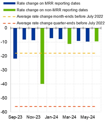 Notes: Averages refer to month-ends (excluding quarter-ends) and quarter-ends (excluding year-ends) over the period January 2022 to June 2023, i.e., before the remuneration of minimum reserve requirements (MRR) was reduced from deposit facility rate (DFR) to 0%. Repo volumes and rates refer to 1-day transactions of MMSR reporting agents’ cash borrowing volumes against all euro area government bond collateral.