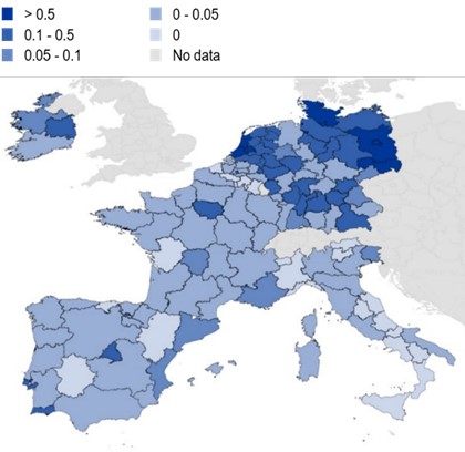 Notes: For each NUTS2 region in our sample, the figure shows the average purchase volume of residential assets by institutional investors between 2007 and 2021, normalised by regional GDP.