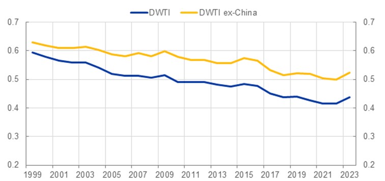 Given China’s very low score, it could be that the observed deterioration in the democratic profile of the EU-15's imports is entirely the result of EU trade with this very influential partner. It is indeed readily apparent that trade with China results in a lower DWTI value. When we re-calculate the DWTI without China, the index is higher on average by about 0.085 points (Chart 2). However, the downward trend since 1999 holds even when excluding China. The index without China declined by one-fifth over the same period, from 0.629 in 1999 to 0.499 in 2022. These findings thus imply that, while increased trade with China has played a role in the deterioration of democracy-weighted trade, they fail to fully explain the reversal observed in the data starting in the late 1990s.