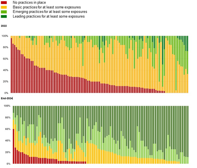 By the end of 2024, 5% of banks had no practices in place, 17% had basic practices for at least some exposures in place, 22% emerging practices for at least some exposures in place and 56% leading practices for at least some exposures in place.