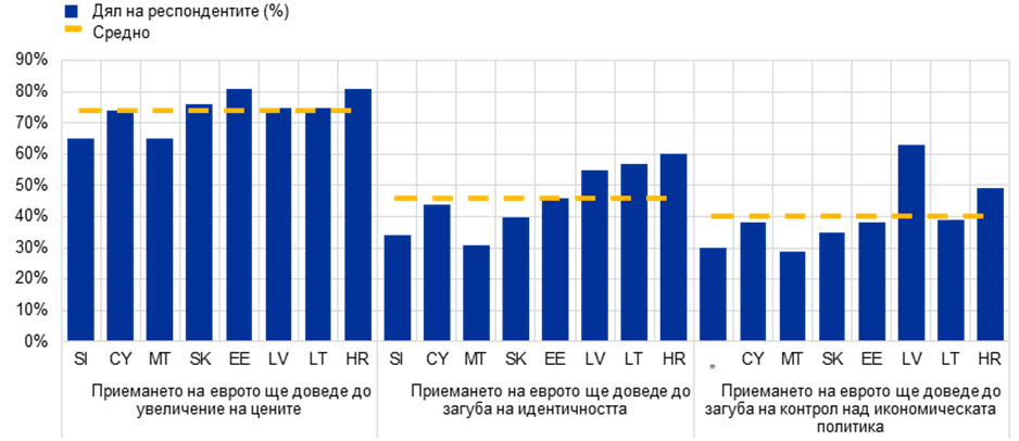 Забележки: Данните включват резултатите от последното налично проучване на Flash Eurobarometer (Introduction of the euro in the Member States that have not yet adopted the common currency) преди въвеждането на еврото във всяка от държавите, както следва: Словения (март – април 2006 г.), Кипър (септември 2007 г.), Малта (септември 2007 г.), Словакия (май 2008 г.), Естония (септември 2010 г.), Латвия (април 2013 г.), Литва (април 2014 г.) и Хърватия (април 2022 г.). Въпросите и посочените в скоби отговори включват „Според Вас, въвеждането на еврото ще повлияе ли и по какъв начин върху цените в (ТАЗИ ДЪРЖАВА)? - [Цените ще се увеличат]”, „Бихте ли ми казали дали сте съгласен или не с всяко от следните твърдения…? Приемането на еврото ще означава, че (НАШАТА СТРАНА) ще загуби контрол над икономическата си политика (%) - [Напълно съм съгласен + По-скоро съм съгласен]” и „Бихте ли ми казали дали сте съгласен или не с всяко от следните твърдения…? Приемането на еврото ще означава, че (НАШАТА ДЪРЖАВА) ще загуби част от идентичността си (%) - [Напълно съм съгласен + По-скоро съм съгласен]“.