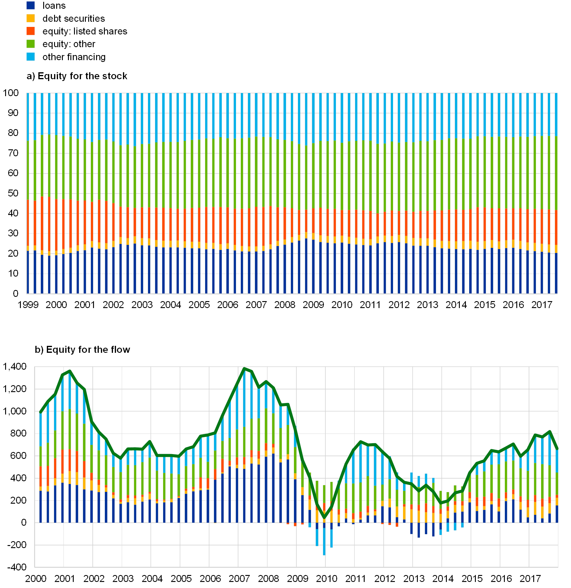 Various forms of equity financing have consistently provided a significant part of the funding structure of euro area NFCs. Owing to its perpetual nature, one euro of equity financing cannot be compared directly with one euro of debt financing. Since debt financing has to be rolled over frequently, it might be more appropriate to judge the importance of equity from a stock, rather than a flow, perspective. On aggregate, listed shares and other forms of equity financing, including the retention of earnings and the issuance of unquoted shares, accounted for 54% of the notional stock of outstanding corporate financing instruments in the fourth quarter of 2017 (see Chart 1a), putting it ahead of loans (20%), debt securities (4%) and other means of financing (22%). The share of equity financing in the outstanding stock of corporate financing instruments measured at market value has remained comparatively stable since 1999. It increased only slightly from 52% in the first quarter of 1999 to 54% by the fourth quarter of 2017. Over the same horizon, the share of loans declined from 22% to 20% and the share of debt securities rose from 3% to 4%.