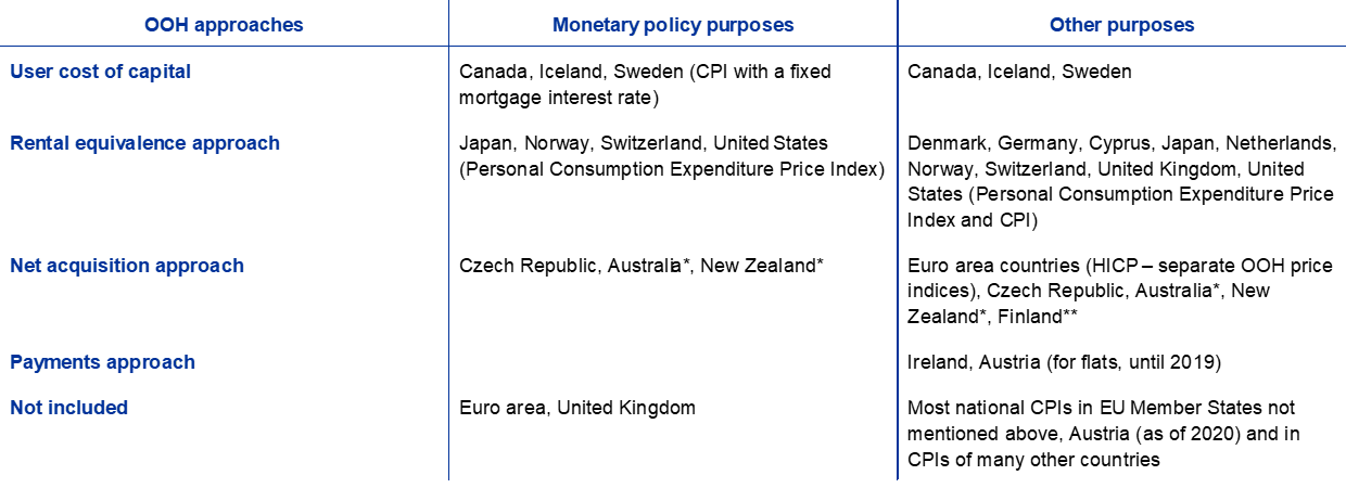 Internationally, there is considerable variation in the way OOH is treated in CPIs, including price indices used as price stability measures by central banks (Table A). In most of the cases presented in Table A, the “rental equivalence approach” is used when OOH is included. Australia and New Zealand apply the “net acquisition approach” in their quarterly CPIs. In the EU, acquisition-based OOHPIs are published as quarterly stand-alone indices. Canada, Iceland and Sweden (in its national CPI) quantify OOH on the basis of the “user cost approach”; the respective central banks also refer to these indices for their monetary policy. The user cost approach includes mortgage interest payments, depreciation and recurring costs. While capital gains/losses and opportunity costs are, in theory, elements of comprehensive user costs, appreciation and depreciation of housing assets over time are, in practice, not included in CPI implementations of the user cost approach. Opportunity costs with respect to alternative investments (e.g. in stocks) are either excluded (Canada, Sweden) or proxied. Finally, the payments approach covers mortgage interest payments, costs such as legal and real estate agency fees, and running costs. The payments approach is (or was) applied in two national CPIs (Ireland and, until 2019 for flats, Austria) and as an alternative stand-alone OOH measure in the United Kingdom.