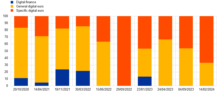 Notes: ”Digital finance” refers to questions targeting digital finance and digital payments in general without specifically referring to a digital euro. “General digital euro” refers to general questions on a digital euro which require basic understanding of the project. ”Specific digital euro” refers to detailed questions on a digital euro which require a deeper knowledge of the project or are targeted at new aspects covered in the introductory statement by the ECB Executive Board member or in recent ECB publications.