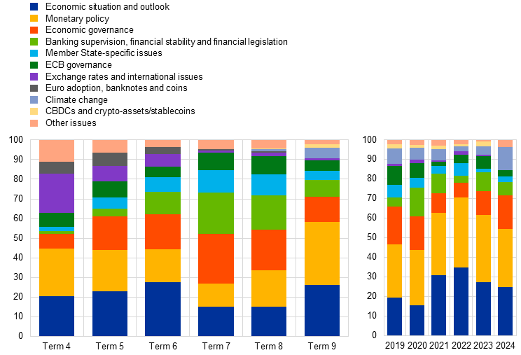 The prominence of different topics varies over time, with monetary policy and the economic situation and outlook taking centre stage in the ninth parliamentary term. Over time, the share of topics has fluctuated notably. Monetary policy and the economic situation and outlook were by far the most discussed topics in the ninth term. Economic governance, including issues such as the EU’s fiscal framework, also remained a relatively popular topic of discussion, albeit less frequent than in previous terms. These three topics alone accounted for around 70% of the questions raised in the ninth term, which was a greater concentration of topics than in previous terms. By contrast, MEPs posed fewer questions on banking supervision and financial stability and Member State-specific issues in the ninth term. At the same time, the number of questions on climate change increased as climate change gained in prominence in the EU’s policy agenda and the ECB took measures to incorporate climate change into its own policies.