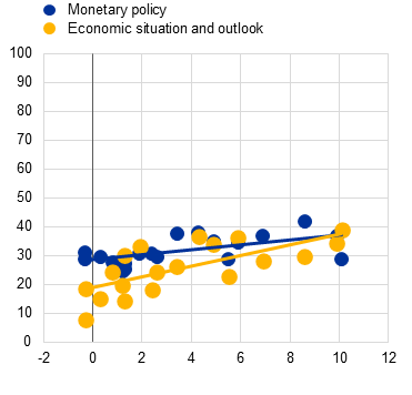 In the hearings that took place in the ninth parliamentary term, questions on monetary policy and especially the economic situation became more frequent as euro area inflation increased. The onset of the pandemic and the launch of the PEPP in March 2020 were followed by a slight increase in questions on monetary policy (Chart 3, panel a). There was another uptick at the September 2021 hearing, which was the first hearing after the announcement on the strategy review in July 2021. Then, as euro area inflation started rising to historic levels following the pandemic and Russia’s invasion of Ukraine, the share of questions on monetary policy increased further – peaking at around 40% in June 2022 when the Governing Council indicated its intention to raise rates. From 2021 onwards MEPs also asked about the economic situation and outlook more frequently, particularly following the significant rise in inflation. Hearings that took place when inflation was high featured a greater number of questions on the economic situation and, albeit to a lesser extent, on monetary policy (Chart 3, panel b).[27],[28]