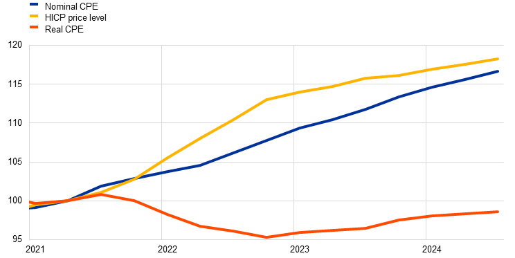 Notes: Real CPE is calculated as nominal CPE divided by the HICP price level. When using the private consumption deflator instead of HICP, the real wage level is similar. The latest observations are for the third quarter of 2024.