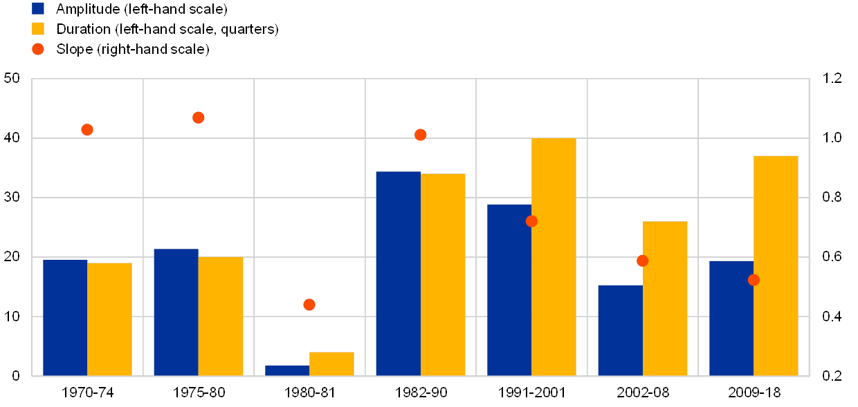 Notes: Advanced economies’ cycles are obtained as a weighted average of the countries in the sample. See the first footnote in this box for country coverage. “Amplitude” refers to the percentage change in real GDP from trough to the next peak in an expansion; “duration” is defined as the number of quarters from trough to the next peak in an expansion; and “slope” is the ratio of amplitude to duration.