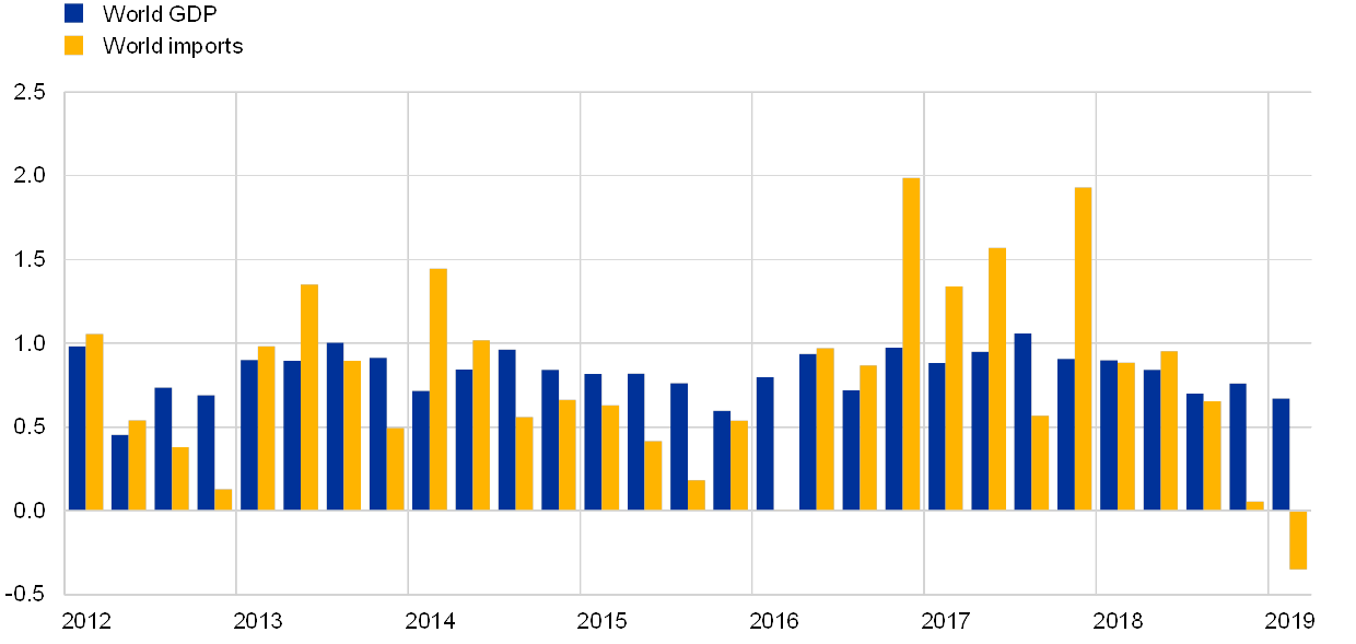 This box looks at the softness in global trade observed since the second half of 2018, focusing in particular on the causes of its decoupling from economic activity. Having already slowed in the third quarter of 2018, world trade contracted at the turn of the year (see Chart A). The deceleration was broad-based across regions. Trade deteriorated particularly sharply in China and in emerging Asia, which had recorded strong increases in 2017, but it also weakened in Latin America, Japan and the United States in the first quarter of 2019 (see Chart B). In contrast, import growth surged in the United Kingdom, probably owing to stock building by UK firms in the face of Brexit-related uncertainty. While global GDP growth has also slowed, the decline was less pronounced than for world trade. Due to significant movements in the most import-intensive categories of expenditure, such as investment and inventories, over the business cycle, trade can be subject to larger swings than activity (see Chart A). For example, world trade remained subdued in the period from the second quarter of 2014 to the third quarter of 2015, while in 2017 it significantly outstripped global activity growth. The decline in trade observed in recent quarters may reflect several factors. These include cyclical and compositional factors, but also influences stemming from rising trade tensions between the United States and China.[1] This box aims to shed light on the reasons behind the recent weakness in global trade and its decoupling from activity.