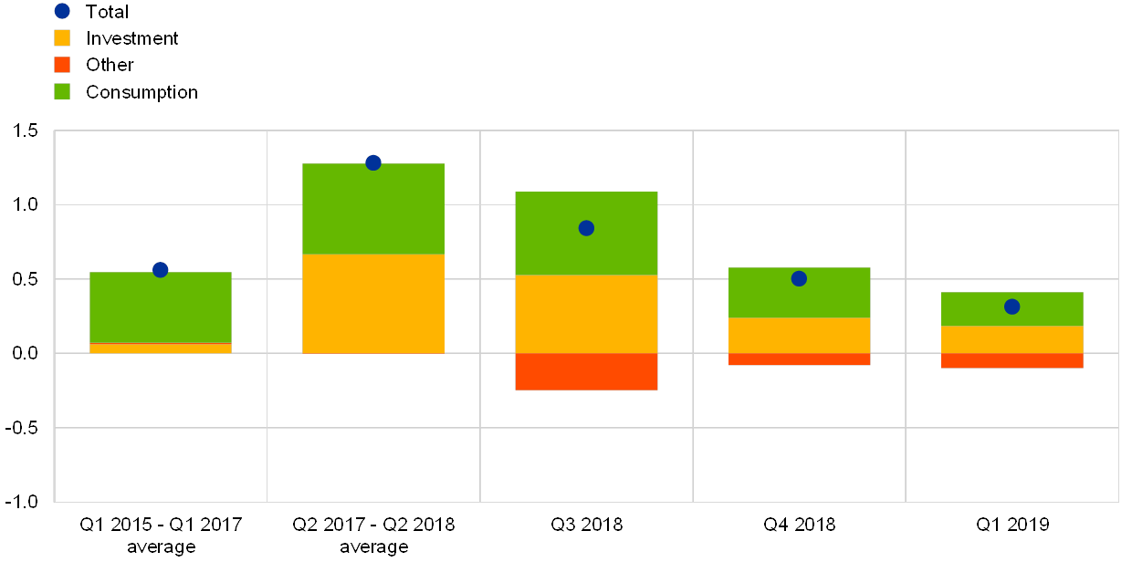 The decoupling of global trade and activity apparent since the second half of 2018 largely reflects a weakening of global investment, although consumption also softened at the turn of the year. Estimates from standard import-demand models suggest that both the previous rise in global trade in 2017 and the most recent slowdown since mid-2018 can be accounted for by large fluctuations in global investment (see Chart C). The recent decline has also occurred on the back of a fall in consumption in some emerging market economies (EMEs).