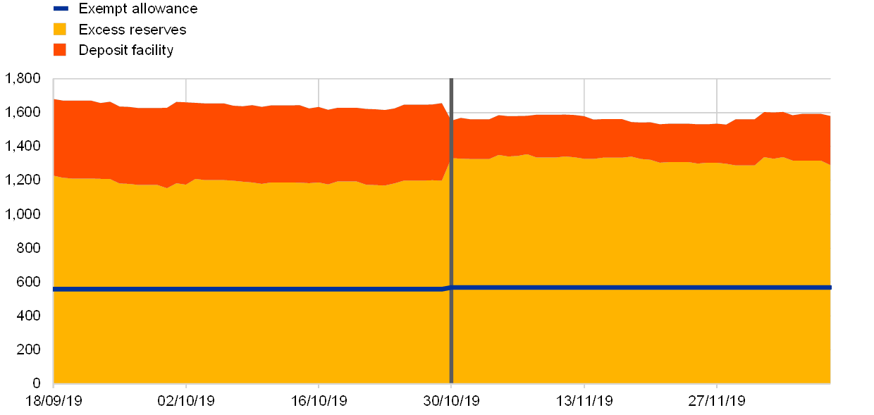 With the introduction of the two-tier system banks holding less excess liquidity than their exemption allowance increased their excess liquidity holdings by borrowing from banks exceeding their exemption allowances. On 30 October 2019, i.e. the day the two-tier system came into effect, banks reduced their unused exemption allowances from 28% to 13% of total exemption allowances. Over the following days banks that had not completely used their exemption allowances continued to gradually increase their excess liquidity holdings until by 11 December less than 5% of exemption allowances were unused (see Chart A). At the same time, excess liquidity held by banks exceeding their exemption allowances declined slightly – indicating a redistribution of excess liquidity through money markets and other channels in line with the incentives laid out by the two-tier system (see Chart B).