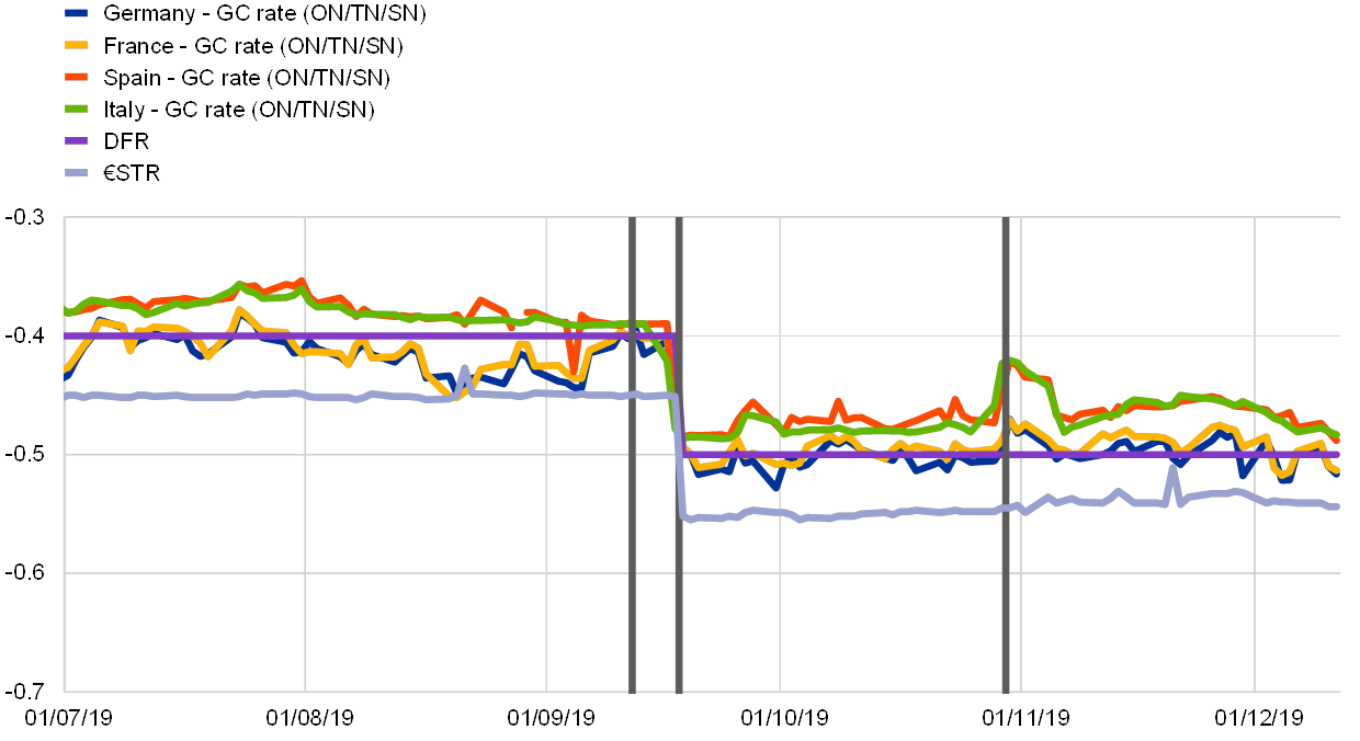 Notes: GC repo rates are volume weighted average rates for German, French, Spanish and Italian collateral, and transactions with O/N, T/N, S/N maturities with the same transaction date. Grey lines mark the September Governing Council (12/09/2019), the start of the sixth reserve maintenance period (18/09/2019) when the rate cut of 10 basis points to the deposit facility rate took effect, and the start of the seventh reserve maintenance period (30/10/2019) when the two-tier system took effect. Pre-€STR until 30 September, €STR from 1 October onwards.