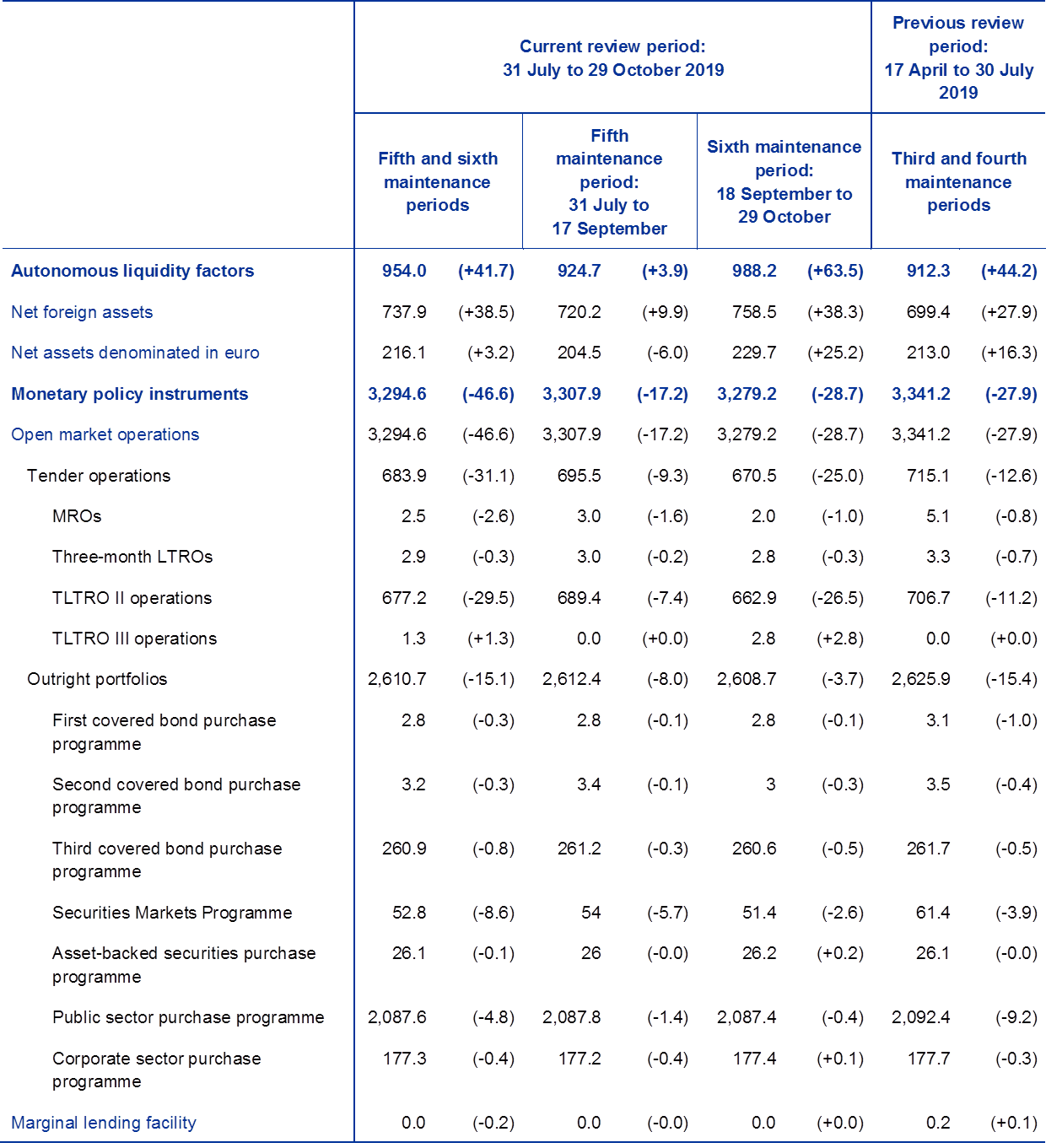 Source: ECB.Notes: All figures in the table are rounded to the nearest €0.1 billion. Figures in brackets denote the change from the previous review or maintenance period.
