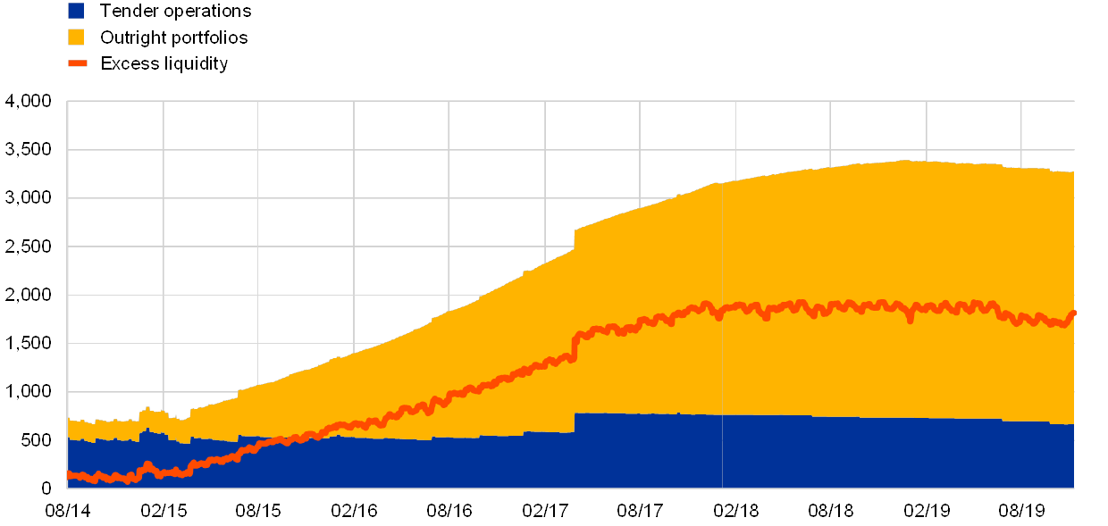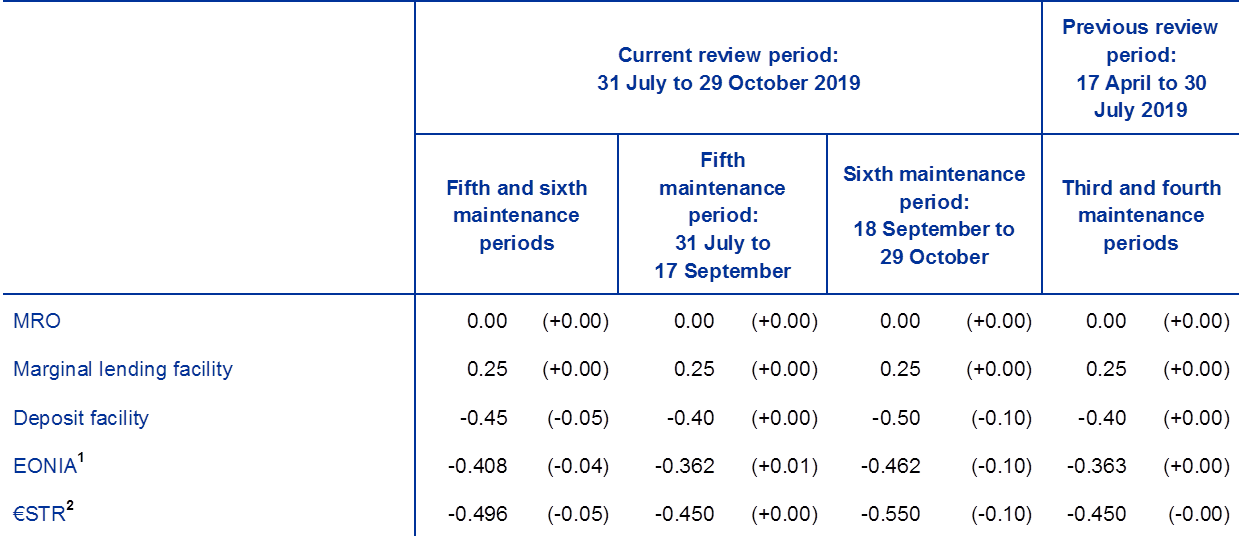 This box describes the ECB’s monetary policy operations during the fifth and sixth reserve maintenance periods of 2019, which ran from 31 July to 17 September 2019 and from 18 September to 29 October 2019, respectively. The review period encompasses the substantial package of monetary policy measures adopted by the Governing Council on 12 September 2019. The package consists of five elements: (i) a reduction in the interest rate on the deposit facility from -0.40% to -0.50%, effective from 18 September, while keeping the interest rates on the main refinancing operations (MROs) and the marginal lending facility unchanged at 0.00% and 0.25%, respectively; (ii) adjustments to the forward guidance on the key ECB interest rates; (iii) the restart of net purchases under the asset purchase programme (APP) from 1 November; (iv) modifications to the modalities of the new series of targeted longer-term refinancing operations (TLTRO III); and (v) the introduction of a two-tier system for reserve remuneration, effective as of the seventh reserve maintenance period starting on 30 October 2019. In parallel, the Eurosystem continued to reinvest, in full, the principal payments from maturing securities purchased under the APP. Furthermore, on 2 October 2019, the ECB started publishing the new overnight unsecured benchmark rate for the euro area, the euro short-term rate (€STR). From that date, the calculation methodology for the euro overnight index average (EONIA) was also changed to calculate EONIA by applying a fixed spread of 8.5 basis points to the €STR.