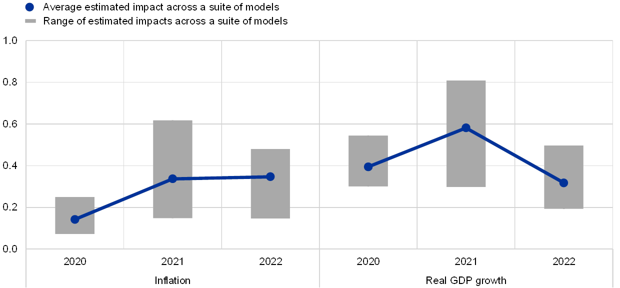 Note: The estimated impact across a suite of models refers to the average across a set of models used by the Eurosystem for policy simulations, a BVAR model (see Rostagno, M., Altavilla, C., Carboni, G., Lemke, W., Motto, R., Saint-Guilhem, A. and Yiangou, J., “A tale of two decades: the ECB’s monetary policy at 20”, Working Paper Series, No 2346, ECB, Frankfurt am Main, December 2019), the NAWM-II model and the ECB-BASE model.