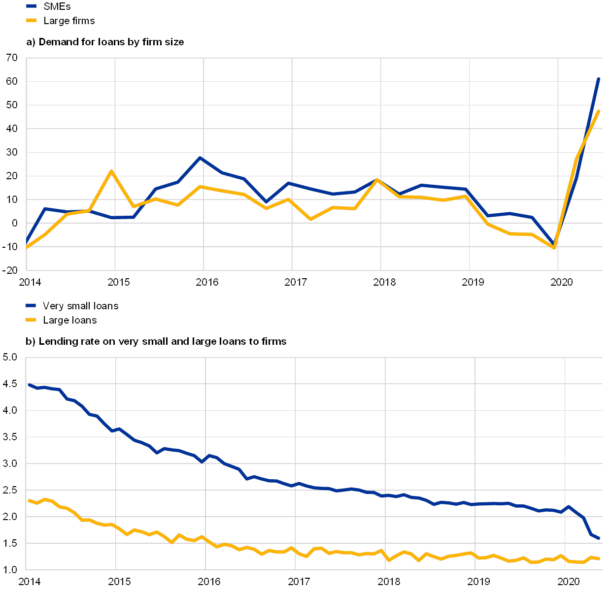 Notes: In panel (a), which is based on the BLS, the latest observation is for the second quarter of 2020. In panel (b), “very small loans” refers to loans of up to €0.25 million. “Large loans” refers to loans of over €1 million. The latest observation is for May 2020.