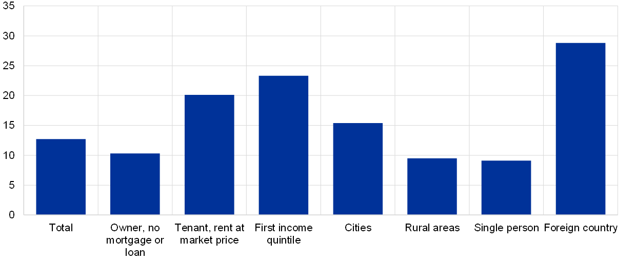 Housing cost burden and overcrowding tend to be distributed unevenly across households. A common indicator of household stretch is the housing cost overburden rate, which is the percentage of the population living in a household where the total housing costs amount to more than 40% of the disposable income.[2] In the euro area, around 10% of households were overburdened in 2019 (Chart A). This aggregate figure masks considerable heterogeneity across households, with 24% of those tenants renting at market price being overburdened, compared with less than 5% in the case of outright owners (mortgage-free owners). Based on the same metric, more than 12% of all households in cities exceeded this threshold in 2019 compared with less than 7% in rural areas. Moreover, and unsurprisingly, around one-third of all households in the lower quintile of the income distribution was overburdened in 2019. In addition, the housing cost overburden rate was high for both single and foreign households (over 20%). Households facing a higher cost overburden rate – tenants, households with lower incomes, those living in cities and foreigners – were apparently also those more likely to be living in overcrowded dwellings (Chart B). Finally, the overburden rate varies considerably across euro area countries and, in general, it appears to be lower in countries where the homeownership rate is higher (Chart C). These developments highlight the importance of household choices and characteristics when it comes to the housing cost burden.
