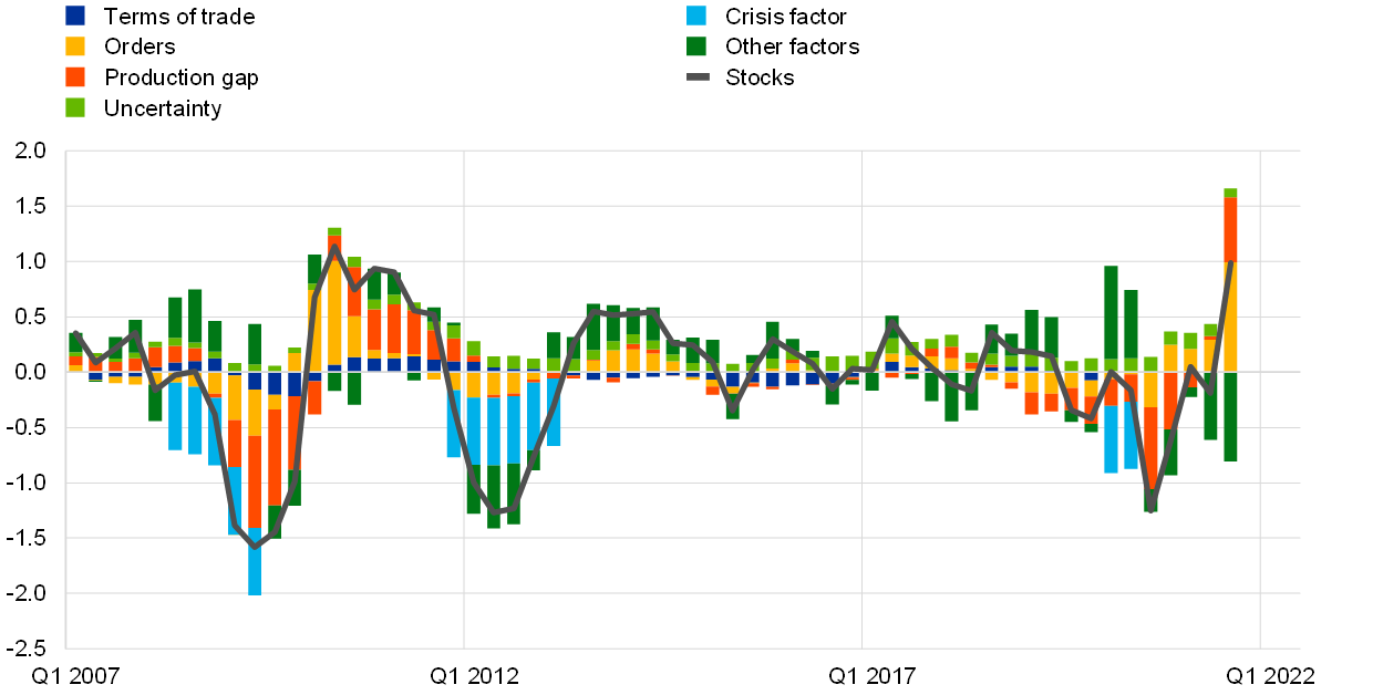 - See the box entitled “Main findings from the ECB’s recent contacts with non-financial companies”, Economic Bulletin, Issue 1, ECB, 2022. Higher than usual finished goods inventories could reflect shipping constraints, a lack of components or high prices, raising the value of inventories and thus the cost of working capital, while unusually low inventories result from high demand.