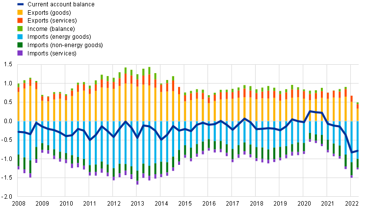Notes: Euro area imports are shown with a minus sign. Total goods trade is included as published in the ECB’s balance of payments statistics, while energy goods trade is based on Eurostat trade statistics. Income balance includes the balances on primary income (e.g. compensation of employees, dividends and interest) and on secondary income (such as international cooperation and workers’ remittances).