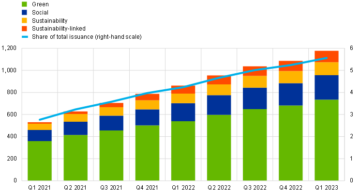 Notes: The observed amounts are for the last day of the reference period. The share of total issuance represents the amount of all sustainable securities as a share of the outstanding amounts of all debt securities issued in the euro area.