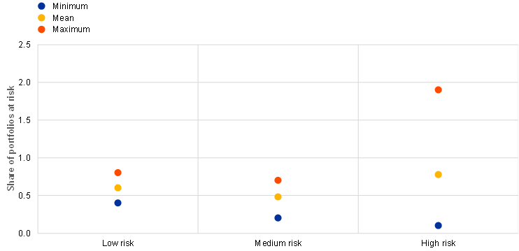 Concerns of firms about natural hazard risks at country level reflect past losses and are correlated with expected future risks (Chart C). The upper panel of Chart C shows a clear positive relationship between the survey-derived weighted average score of the relevance of natural hazard risks for firms’ business activity and cumulative past losses incurred from different disasters in the last 40 years at country level.[4] However, the correlation is less strong when comparing survey-based country scores – grouped into low, medium and high risk buckets – with a forward looking measure derived from approximating banks’ expected annual losses on corporate loans due to natural hazards in a climate baseline scenario (Chart C, bottom).[5] Higher risk assessments by firms are only weakly correlated with significantly higher expected future losses stemming from climate change. Moreover, in buckets where firms attach high importance to the risk of natural hazards, the distribution of expected losses is wider. This could indicate that future climate change developments are not yet fully accounted for in the risk assessments of firms, given the degree of uncertainty surrounding future climate scenarios.