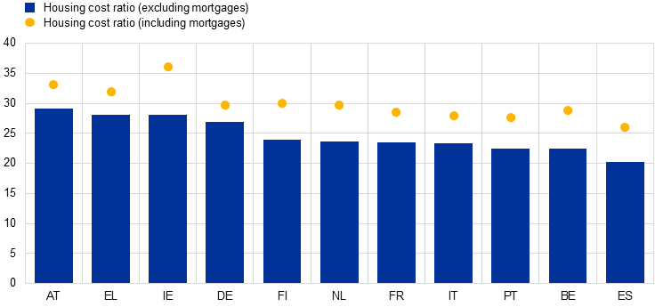 Notes: The calculations are based on weighted estimates. Average total housing costs comprise home maintenance and utility costs, together with rent for renter households or debt repayments for mortgagors, these costs being winsorised for each ownership type. It is assumed that for mortgagors, debt repayment primarily consists of the payment of principal and interest on mortgages. In panel b), housing costs include home maintenance and, for renters, also comprise rent. In panel c), countries are ordered by housing costs in descending order.