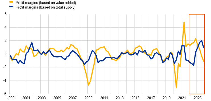 Taken together, the GDP (value added) and total supply-based profit margin indicators suggest that in 2023 profits started to buffer the impact of labour cost developments on price pressures but benefited from the decline in other costs. According to the GDP-based indicator, profit margins grew in 2022 but started contracting in 2023 in line with a buffering of labour costs in the second half of that year. [6] However, the total supply-based indicator suggests that profit margins declined in 2022 and, after increasing somewhat in the course of 2023, have started to slow more recently but remained positive.[7] In other words, it suggests that profit margins buffered total costs in 2022 when import prices surged, but increased in 2023, benefiting from the decline in import prices.