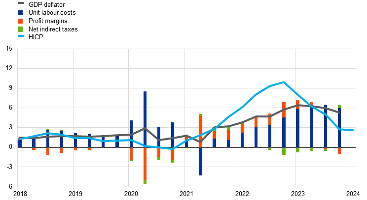 Notes: The latest observations are for the first quarter of 2024 for the HICP and for the fourth quarter of 2023 for the other data. Panel a): unit labour costs (TS) and unit imports (TS) are shown as percentage point contributions to unit total costs (TS).