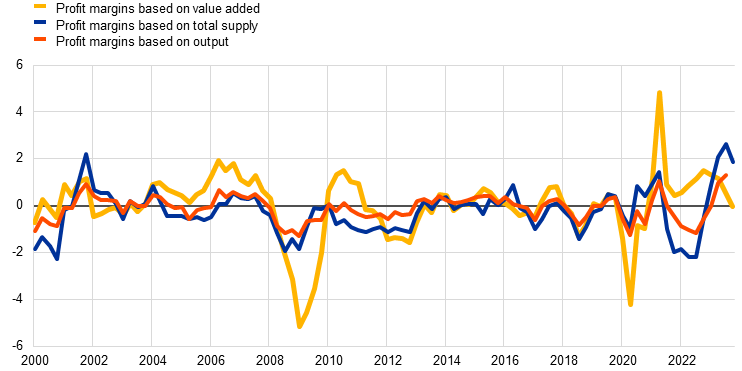 Growth rate of profit margins based on value added, total supply and output for a limited sample of euro area countries
