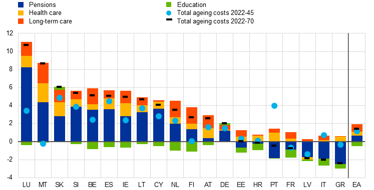 Rising ageing costs are a key consideration in assessing long-term fiscal sustainability. Demographic shifts, leading to a greater proportion of elderly citizens and increased demand for pensions, health care, and long-term care services, will strain public finances. The evolution of ageing cost projections reveals that while progress has been made in some countries, the challenges ahead remain substantial. To address the economic and fiscal consequences of population ageing, there is a need for fiscal buffers, a more growth-friendly composition of public finances and structural reforms.[8] Furthermore, to limit the adverse impact on potential growth, productivity-enhancing policies are needed – for example policies promoting innovation, life-long learning and a faster integration of migrants into the labour market.