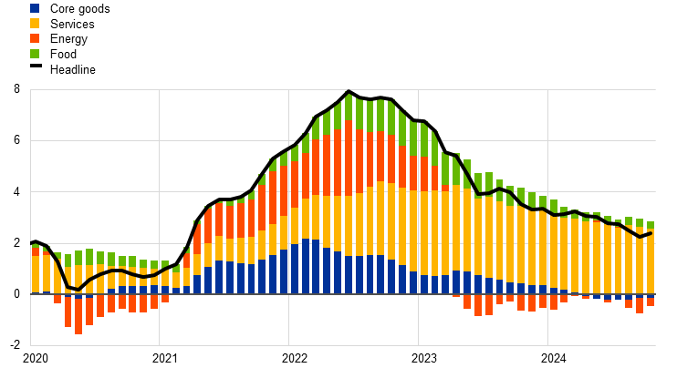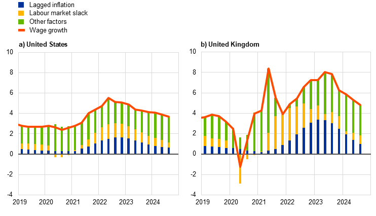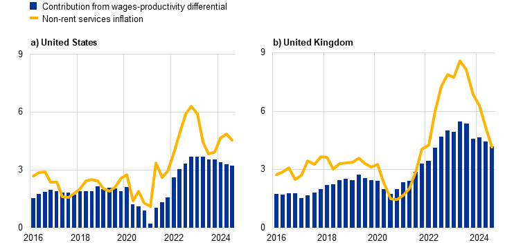 In the case of non-rent services inflation, empirical analysis suggests that wage growth has been a key driver. The results of an econometric analysis indicate that wage inflation has generally been the main driver of core services inflation excluding rent (Chart B).[3] Input prices also played an important role in the strong rise in services inflation in 2022 and 2023, when producer prices inflation was pushed up by supply bottlenecks and large energy shocks, reaching levels twice as high as before the outbreak of the COVID-19 pandemic.[4] However, as input price pressures have receded on the back of a strong deceleration in producer price inflation, nominal wage pressures have become the main driver of services price inflation. The sources of inflationary pressures have thus shifted away from global and towards domestic factors, reflecting second-round effects as nominal wages start to catch up with inflation.[5] This is consistent with persistently high nominal wage inflation in the United States and the United Kingdom, which stood at 3.9% and 5.3%, respectively, in the second quarter of 2024, and the persistence of services inflation, despite downward pressure stemming from other factors.