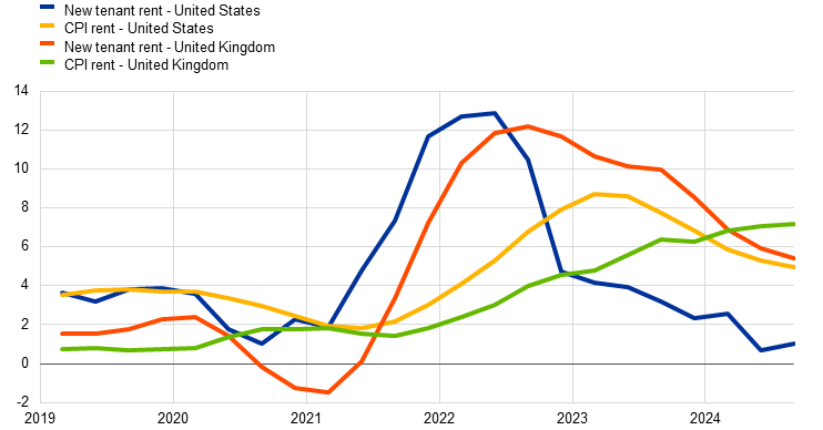 Notes: Quarterly observations computed as three-month averages of monthly data. The latest observations are for the third quarter of 2024. Owing to data availability, the observation for the third quarter of 2024 for “New tenant rent – United Kingdom” corresponds to July 2024.