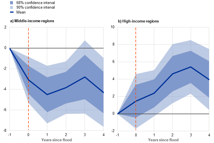 Turning to the effects on real economic activity in more detail, the impact of floods can vary greatly across sectors and regions.[5] Whereas flooding is typically followed by an extended yet temporary period of booming construction in high-income regions, we observe no such surge in construction in middle-income regions (Chart A).[6] At the same time, we find evidence of a permanent negative shift in the level of industrial gross value added in middle-income regions and a positive shift in high-income regions. In terms of sectors other than construction, some studies find that moderate flooding can boost agricultural production in the year following a flood, perhaps as a result of greater rainfall boosting agricultural productivity in future harvests.[7] But this effect seems to dissipate with severe flooding, possibly due to soil erosion offsetting the beneficial impact of rain.