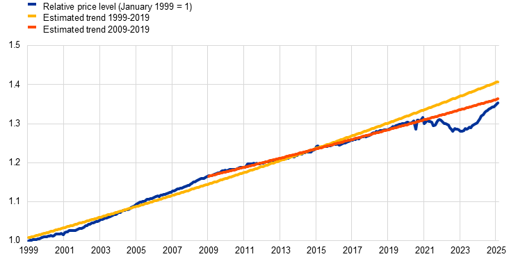 Notes: The chart shows price developments in services relative to those for NEIG. The data are seasonally adjusted. The latest observation is for February 2025. Trends are estimated by regressing the logarithm of the relative price level on a constant and a linear trend.