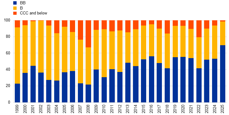 The composition of US corporate bond issuance among high-yield issuers, which shifted towards higher-quality bonds, also supported the aggregate compression in spreads. Since 2007, the proportion of BB-rated bonds among new issuances in the high-yield category has been increasing, while the issuance of riskier B-rated bonds has been declining, and the issuance of bonds rated CCC or below has remained relatively low and has been particularly low in the last two years (Chart C). At the same time, the number of downgrades and upgrades of corporate bonds has been relatively balanced. The trend towards less risky high-yield bonds might also reflect relatively robust corporate balance sheets and profitability in recent years and may have contributed to the overall lower spreads.