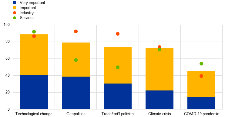 This box summarises the findings of a recent ECB survey of leading non-financial companies on the outlook for business investment.[1] The survey, carried out between 7 April and 14 May, asked firms about recent and expected euro area and global investment decisions and the factors driving or constraining these. Responses were received from 64 companies with an aggregate global revenue equivalent to almost 4% of euro area GDP. Of these, 39 are mainly active in the industrial sector, while the other 25 focus primarily on services.
