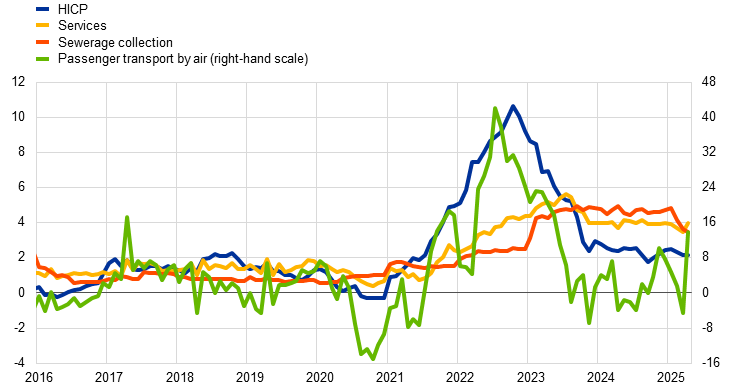 The HICP services consumption basket comprises price indices with very different annual inflation rates. On the one hand, services include items related to travel, where prices tend to adjust to economic conditions and shocks very quickly. For example, the annual increase in prices for passenger transport by air shot up to 40% in mid-2022, ahead of the peak in total services in July 2023. Since mid-2023 it has occasionally recorded negative rates. On the other hand, prices of other components have shown stable annual increases, with very low volatility; for example, sewerage collection, where prices have risen very gradually, lagging the total services prices (Chart A).