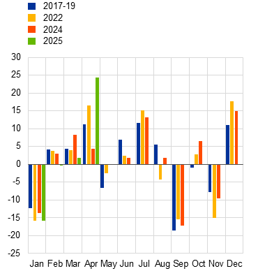 At the beginning of 2025, items that are repriced annually remained an important factor behind the persistence of services inflation. As price changes for items with annual repricing occur predominantly in January, their month-on-month changes in January offer useful insights into annual inflation developments. In January 2025 annually repriced items with administered prices showed the strongest month-on-month increase, which even surpassed the rise seen a year ago. By contrast, price changes in non-administered annually repriced items eased compared with the previous year (Chart E). The inflation rate of services items without a repricing pattern has also declined visibly as of January 2025. However, part of the drop in March and the rebound in April reflects the different Easter dates in 2024 and 2025. The decoupling of administered price inflation from broader services inflation should be closely monitored, as forecasting models are not able to appropriately capture the drivers of price dynamics for these services, which are often strongly linked to fiscal considerations.